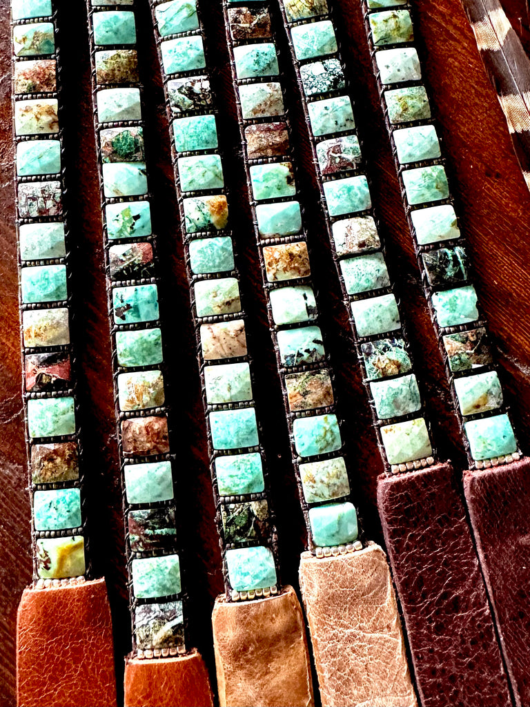 Loomed between dark brown sinew, this beautiful Peruvian turquoise, also known as chrysocolla turquoise, displays a special array of color.  This color palette boasts the most beautiful mix of teal and greens, along with veins of copper that add to its natural color.